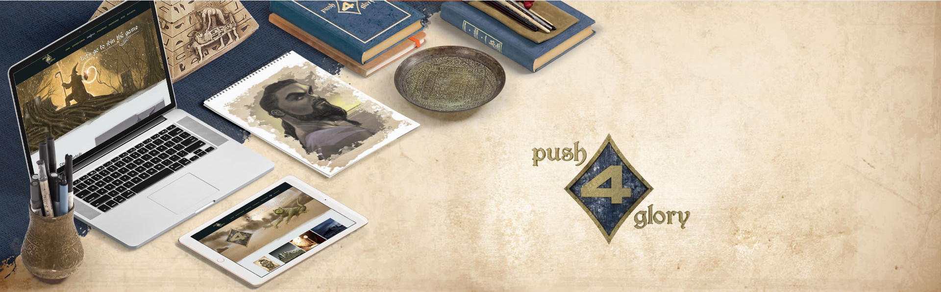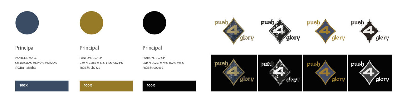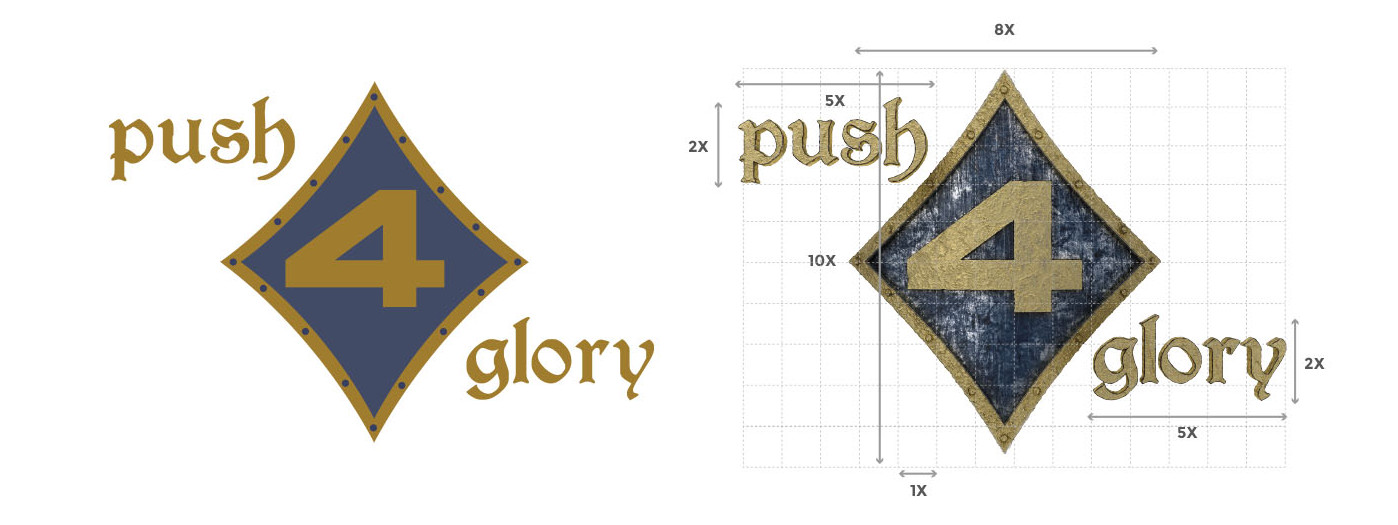 Para desarrollar el logotipo de Push4Glory nos inspiramos en la forma tradicional de un escudo, fusionando la propuesta con elementos representativos del mundo del póquer. Para definir su apariencia definitiva, se utilizaron programas de diseño 3D que otorgaron al boceto envejecimiento, realismo y volumen.